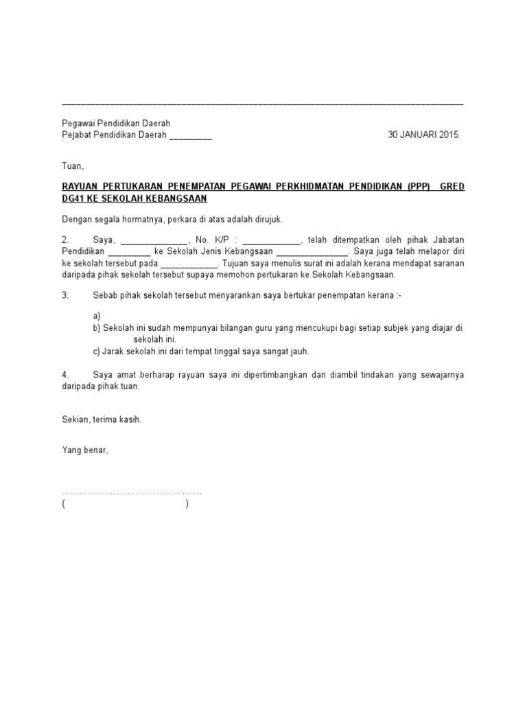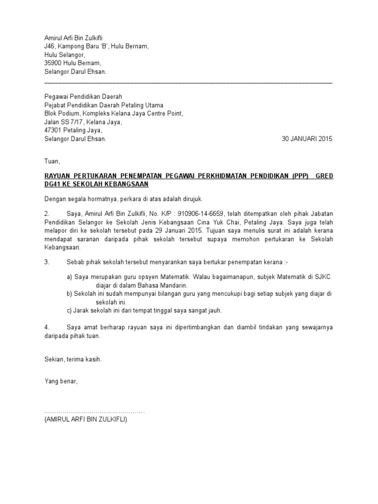 Merujuk perkara di atas saya nama guru di. Sehubungan dengan itu saya memohon pertukaran saya dipertimbangkan dengan sewajarnya atas sebab-sebab berikut. Datang terus ke kaunter unit laporan.