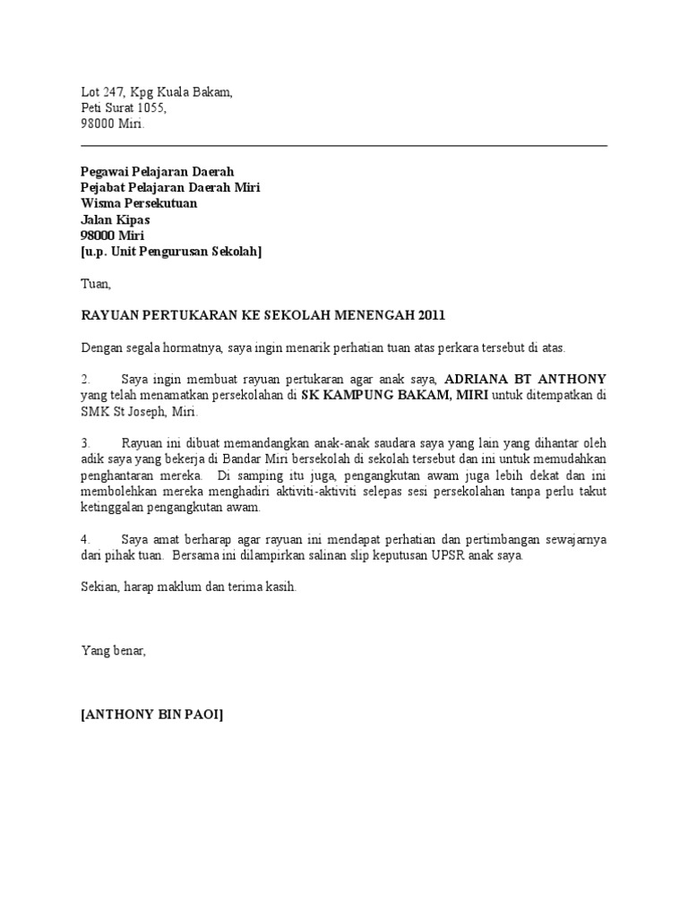 Web Contoh surat rayuan pertukaran sekolah rendah surat rasmi u. Contoh surat permohonan pertukaran sekolah anak. Web Jadi kalau ada pertukaran sekolah PPD negeri berkhidmat semak betul-betul ya.